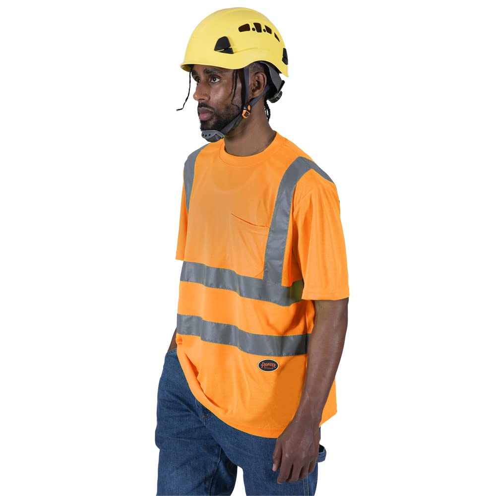 Pioneer Hi Vis Safety T Shirt for Men - Short Sleeve with Pocket- Reflective Tape - High-Visibility T-Shirt – Dry Wick, Lightweight Tee – Orange or Yellow/Green—