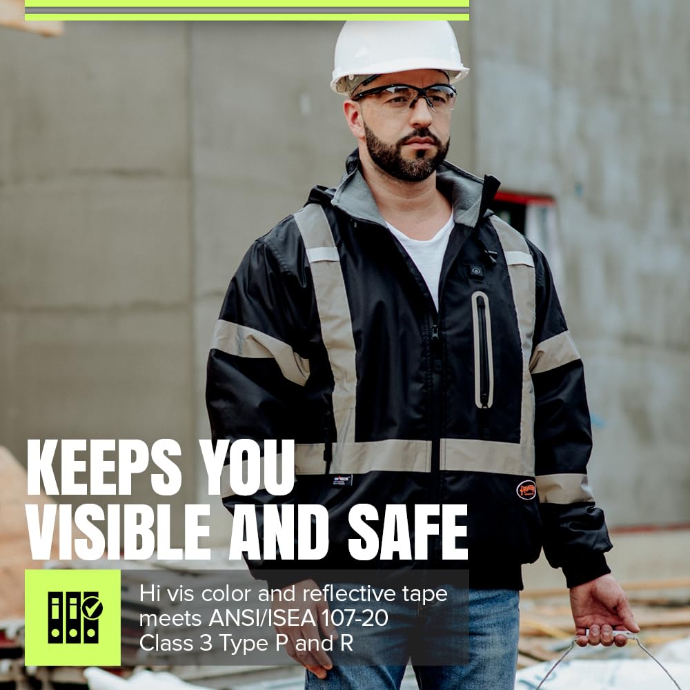 - HI VIS WINTER SAFETY BOMBER – Pioneer’s Hi Vis Heated Nano Bomber Jacket is made for cold weather work in low light conditions. Machine washable.